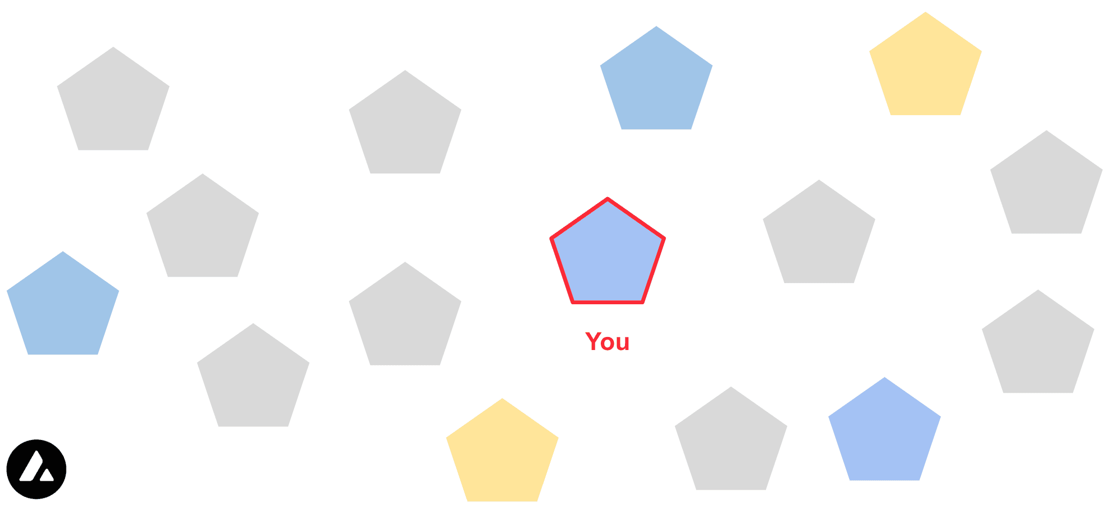 Let's visualize this with an example. You are a validator in a set of validators that is performing the Avalanche Consensus protocol to agree on whether to send the funds to Charlie (yellow) or to Bob (blue). It is important to understand that none of the validators really cares whether it is going to be yellow or blue, as long as all correctly operating validators decide for the same outcome at the end of the process. The starting preference is chosen randomly by each validator.